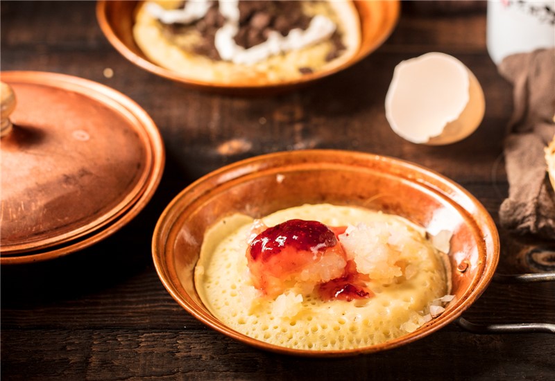 施嬢嬢蛋烘糕:酥脆松軟的外皮從被師傅從小平底鍋里夾出來,餡料豐富,咸甜麻辣任選,金燦燦、香噴噴、一口咬下去,綿軟滋潤,一場舌尖的SPA。