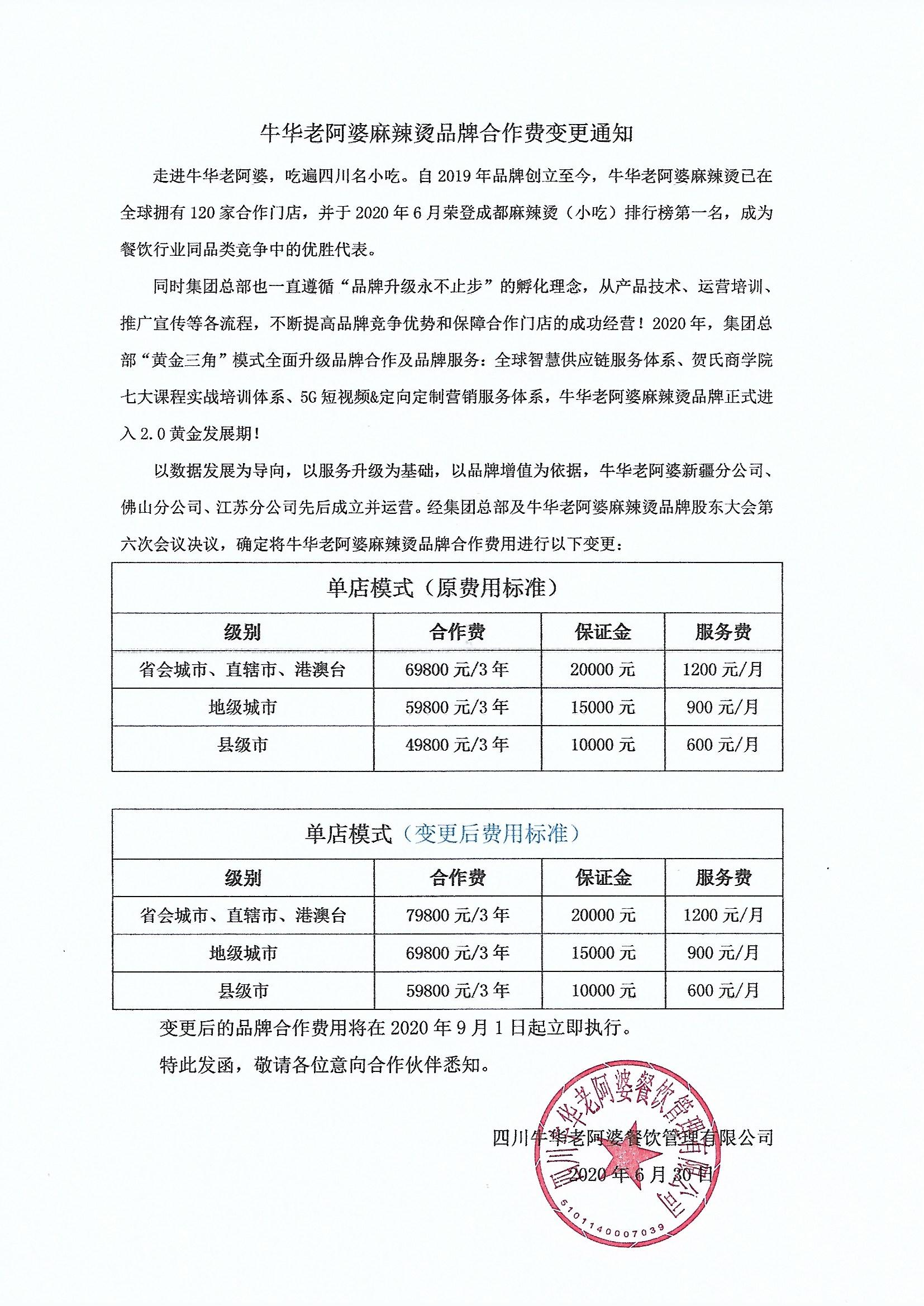 鑒于品牌全方位升級(jí)賦能及行業(yè)發(fā)展趨勢(shì),經(jīng)集團(tuán)總部研究決定:牛華老阿婆麻辣燙品牌各階梯合作費(fèi)將全部上漲10000元整。考慮到已咨詢、預(yù)約考察或已繳納定金預(yù)定名額的加盟商伙伴的權(quán)益,該項(xiàng)決定自2020年9月1日開始全面執(zhí)行。